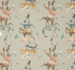 This stunning animal print fabric includes the colours, taupe, black, white, grey, beige, brown, orange, pink and blue.
