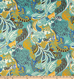 This African cotton print fabric includes the colours, shades of blue and green, cream, black & yellow.