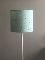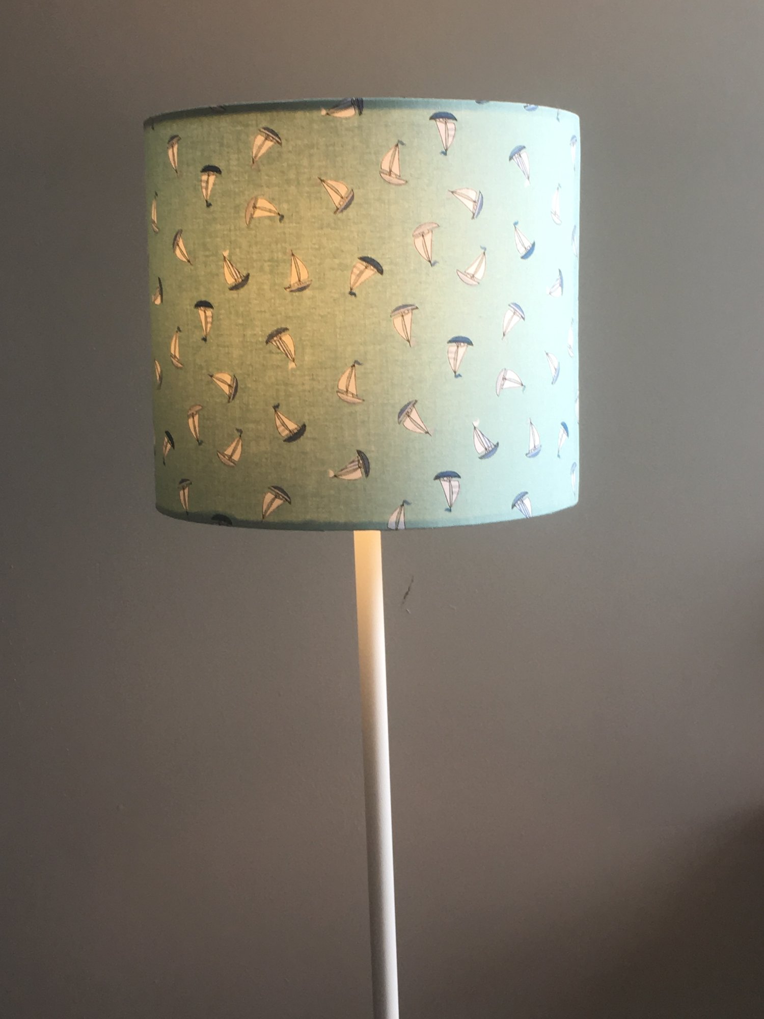 This lampshade has a lovely nautical theme with a tossed sailboat print allover. It includes the colours, black, white and shades of blue on a jade background.