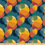 This stunning sixties retro print fabric includes the colours, shades of blue, yellow, green, orange and red.