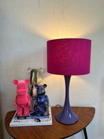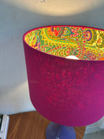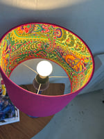 This one off double sided shade features washed linen Fuchsia Pink on the exterior and Paisley Jungle Green fabric on the interior.