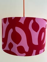This is a one off 40cm double sided shade, featuring a red and pink swirl design on the exterior and a black and white striped interior.