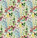 This cotton floral print fabric from Sally Kelly fabrics includes the colours ivory, pink, yellow, orange, blue, purple, green and red. Gardenia features fields of wild flowers, small ditsy prints, and butterflies with bright pops of colour.
