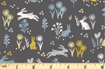This gorgeous cotton print of hopping rabbits includes the colours grey, white, blue, and yellow.