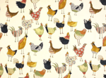 This fun print of a selection of chickens includes the colours, cream, shades of green, yellow, orange, red and black.