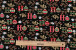 This cotton fabric print features a Hoho with Christmas baubles & holly. Colours include, black, gold, red, white & green.