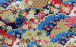 This is a Japanese scenic print on a cotton fabric with gold foil detail. Colours include Navy, shades of blue, red, white and gold.
