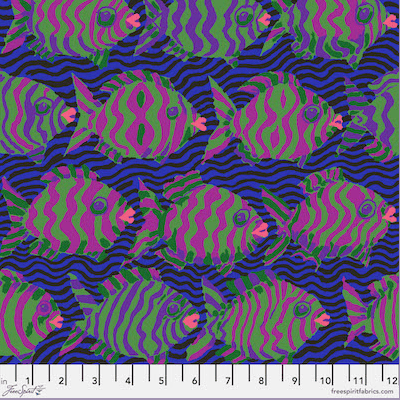 This fun pattern fabric of fish includes the colours shades of blue, purple, green and pink.