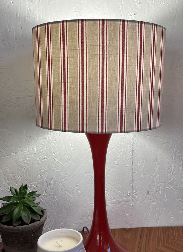 This ticking stripe cotton fabric includes the colours, beige, red and off white.