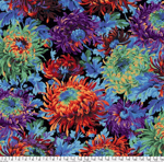 This beautiful floral pattern fabric includes the colours shades of blue, purple, red, green, pink, orange and black.