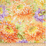 This beautiful floral pattern fabric includes the colours red, yellow, white, shades of green, shades of orange, and shades of purple.