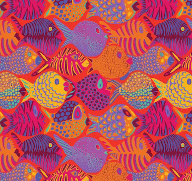 This fun pattern fabric of fish includes the colours shades of orange, red, yellow, blue and purple.