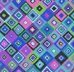 This vibrant print fabric includes the colours, shades of blue, purple, pink, green and black.