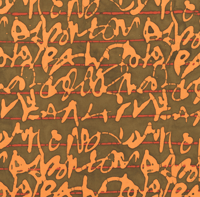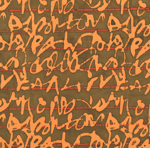 This cotton batik print fabric from Marcia Derse fabrics includes the colours green/brown and shades of orange.