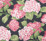 A stunning floral print featuring hydrangeas on a cotton fabric. Includes the colours black, shades of green and pink & white.
