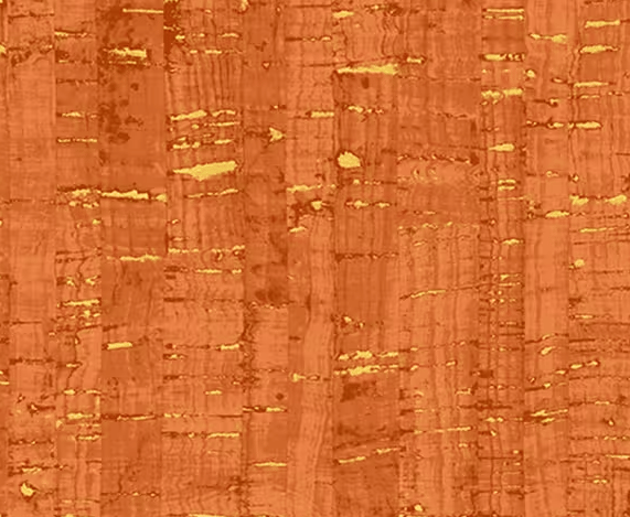 This cotton print fabric features a metallic crackle ground that resembles a cork board. Colours include Mandarin Orange and metallic gold..