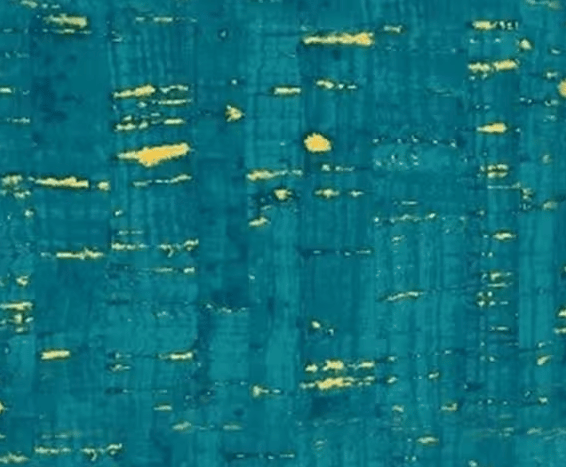 This cotton print fabric features a metallic crackle ground that resembles a cork board. Colours include Turquoise Blue and metallic gold..
